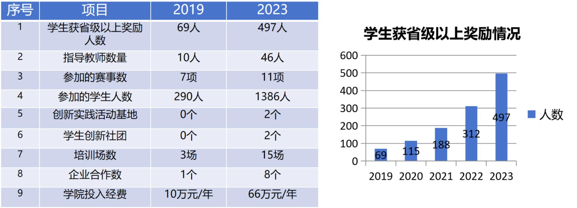 本实验教学中心积极组织本科生课外科技活动,主导了本科生创新社团“创新者协会”,打造了本科创新平台,并获得了一系列奖项。学生获得省级以上奖励的人数、指导教师数量、赛事参与数等各项指标都得到了显著提升,呈现出明显的增长趋势。