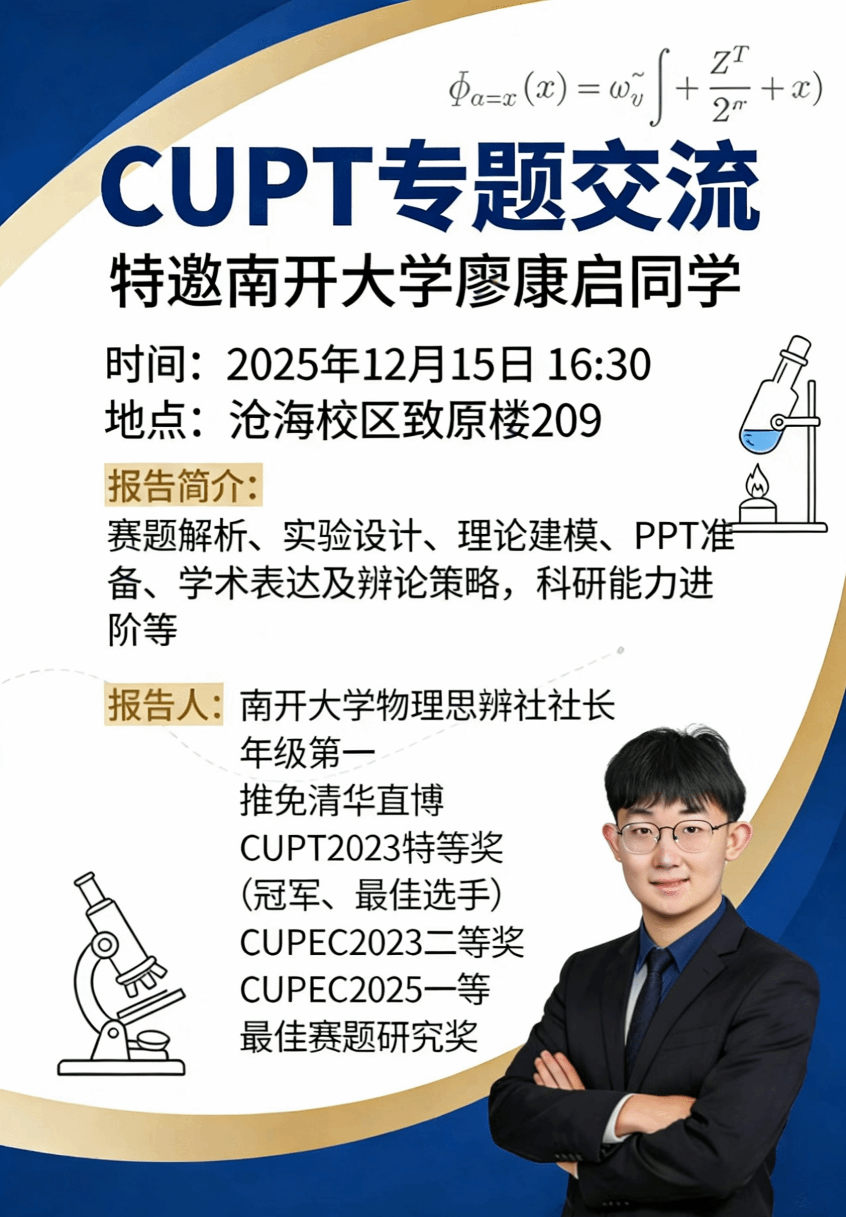 为提升我校本科生在中国大学生物理学术竞赛(CUPT)中的综合能力,特邀南开大学廖康启同学来校开展专题交流。南开大学作为国际青年物理学家锦标赛(IYPT)引入中国的发起单位、CUPT传统强队,长期在赛事中保持卓越表现,多次获得全国决赛一等奖及总冠军。