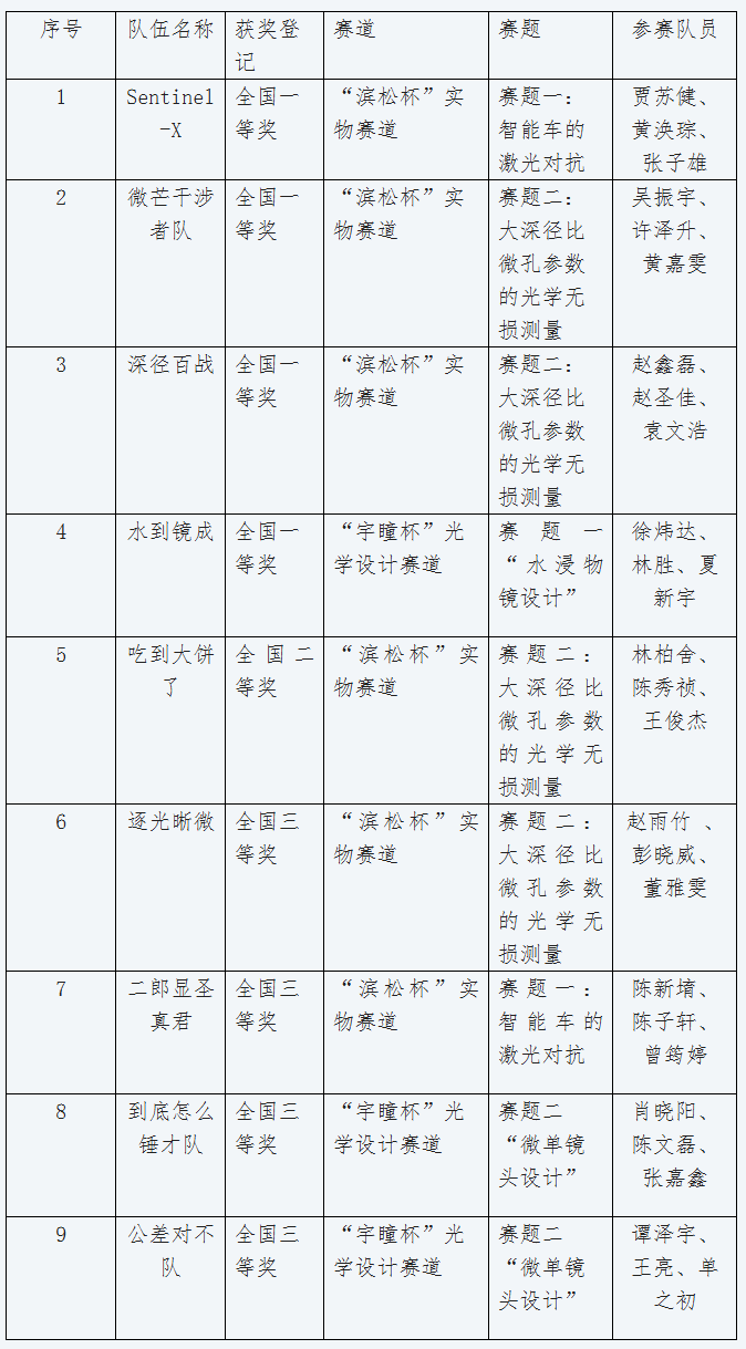 “宇瞳杯”光学设计赛道我校组织了14支队伍参赛,经校赛选拔,3支队伍进入国赛,并最终获1项全国一等奖和2项全国三等奖。同时,获得优秀组织奖。