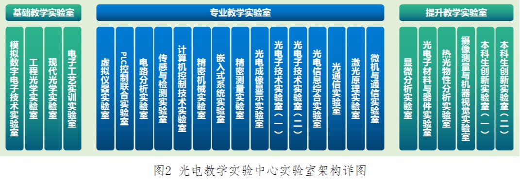 光电教学实验中心服务于光电信息科学与工程、测控技术与仪器两个本科专业,中心每年开设不少于55门实验课程,共约900学时,参加各种实验的学生不少于3000人次。中心的服务内容主要介入实验课教学、课程设计、毕业论文实验、创新实践等实践教学环节,为学生的专业学习提供了良好的教学实验环境。中心下设25个功能实验室,如图2所示,总计本科教学实验仪器设备约4500台套,价值6000余万元。光电教学实验中心为光电信息科学与工程专业创建国家级一流本科专业,测控技术与仪器专业创建广东省一流本科专业提供了良好的教学实验环境。